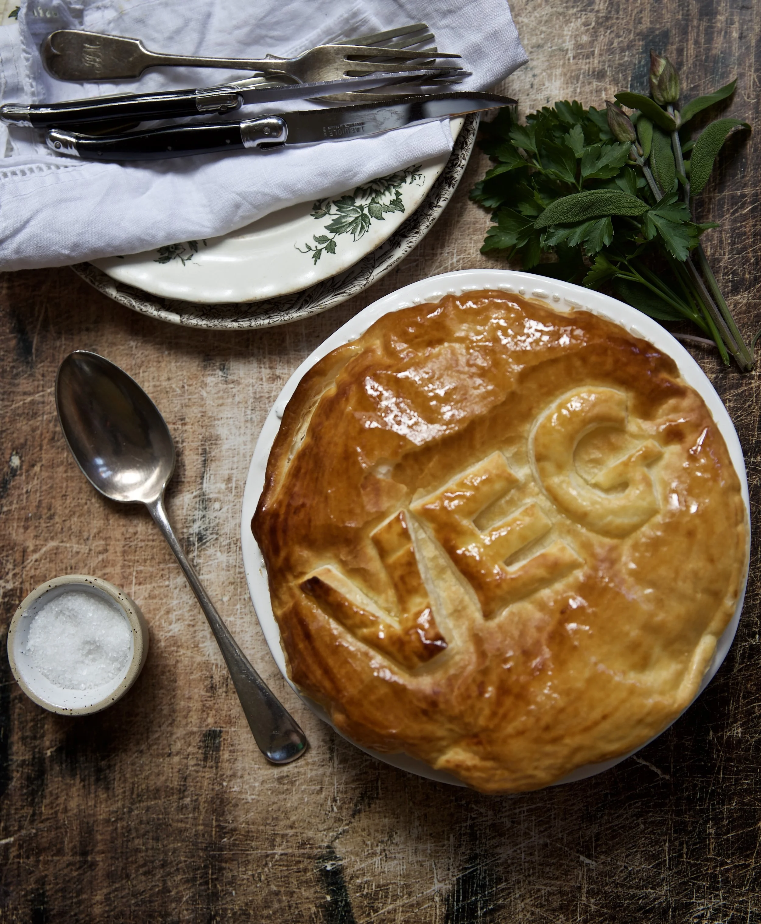 Topping the pie: Lay the Heritage Bakers Puff Pastry over the filling, letting it overlap slightly. Press the edges to seal and crimp if you like. Cut a small steam hole in the centre.